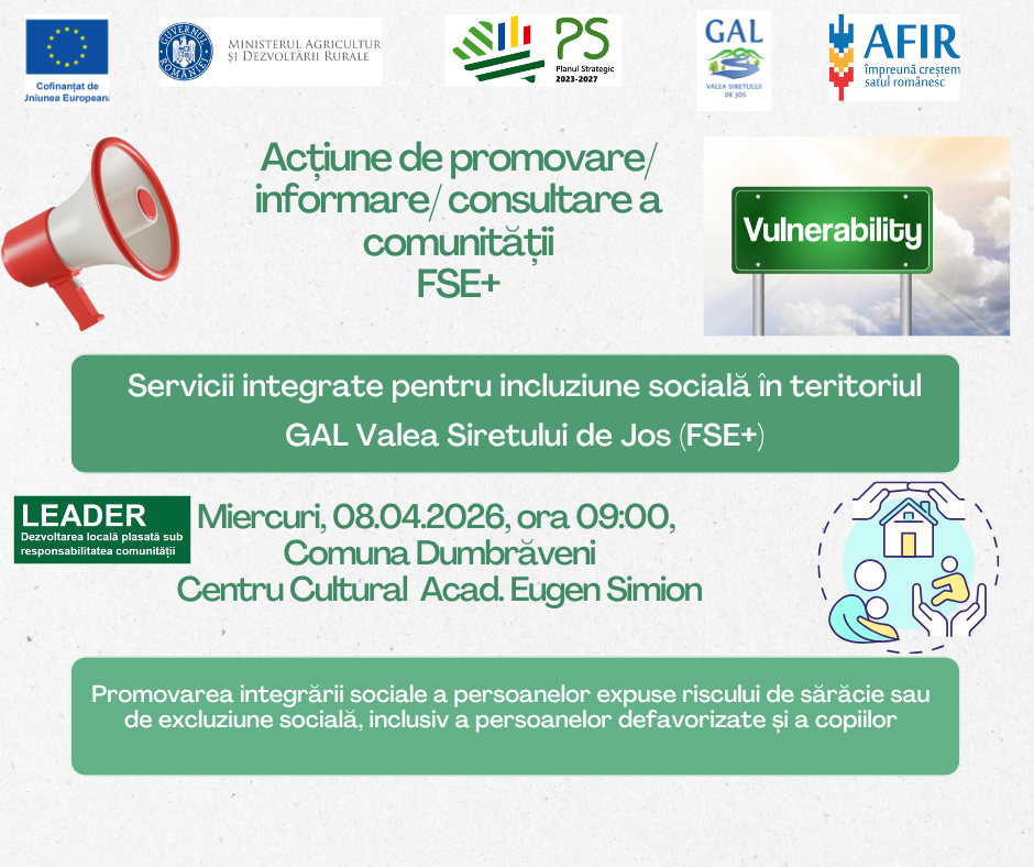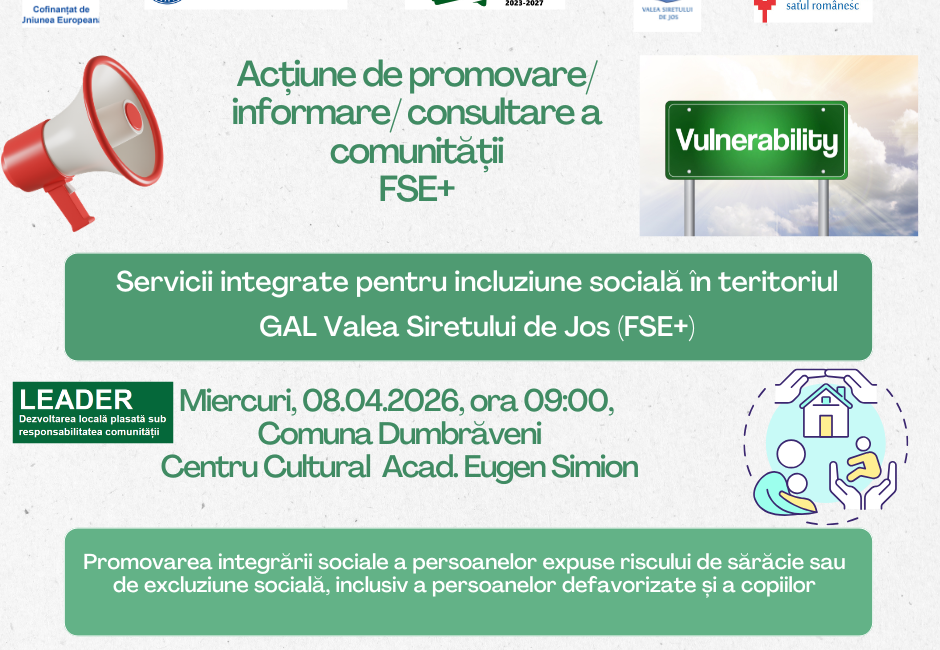 „Servicii integrate pentru incluziune socială în teritoriul GAL Valea Siretului de Jos (FSE+)”